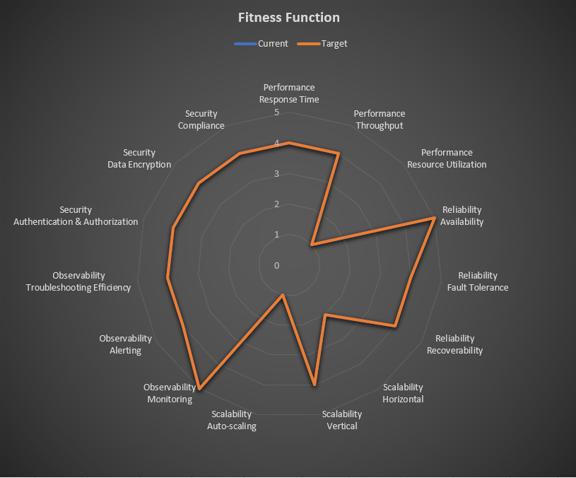 Imagine a radar chart mapping out these targets, guiding teams to architectural success with precision and clarity. Armed with measurable numbers, developers can confidently showcase their MVP’s prowess, backed by concrete evidence of its architectural soundness. Below is an example of a sample fitness function in a radar chart.